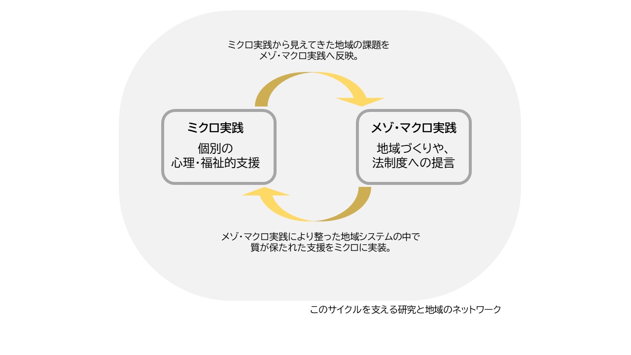 個別具体の支援(ミクロ)・地域づくり(メゾ)・法律などの国全体の制度(マクロ)を循環させるとともに、研究と実践のエビデンスとネットワークでこれらの活動を支えます。